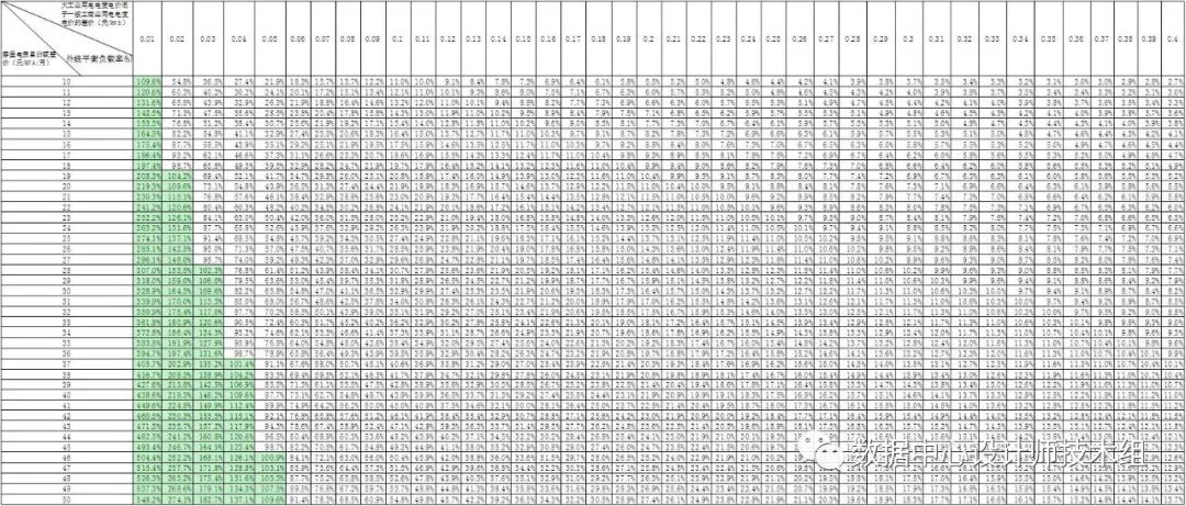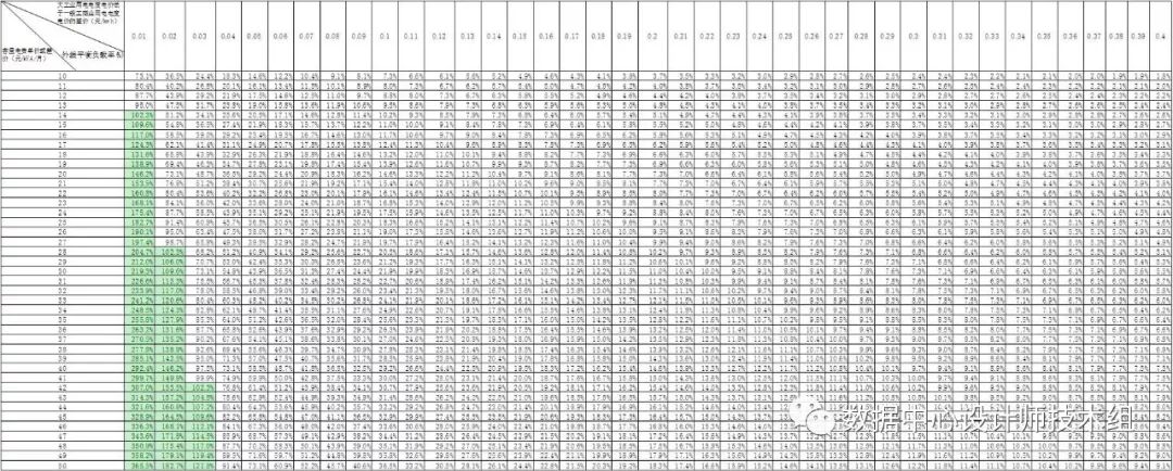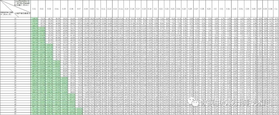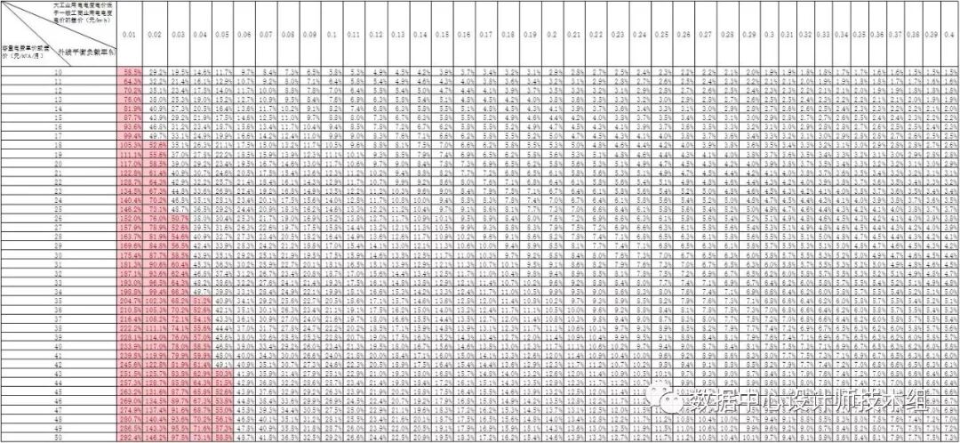 本函數(shù)表的橫坐標(biāo)為大工業(yè)電價(jià)相比一般工商業(yè)用電,電度電價(jià)便宜的價(jià)格(元/kwh)。縱坐標(biāo)為最大需量申報(bào)的容量電費(fèi)單價(jià)或差價(jià)(元/kVA/月)。數(shù)據(jù)區(qū)為數(shù)據(jù)中心的外線平衡負(fù)載率(%),是指數(shù)據(jù)中心采用大工業(yè)電價(jià)與一般工商業(yè)電價(jià)繳費(fèi)相等的情況下,數(shù)據(jù)中心實(shí)際用電容量(kVA)占外線總?cè)萘浚╧VA)的比例。