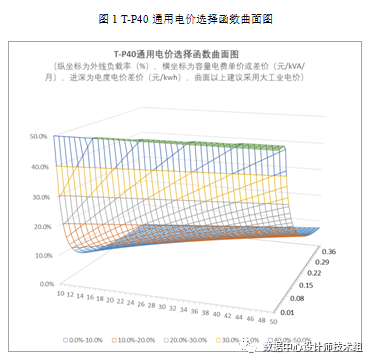 經(jīng)過推算,筆者建立了T-Power通用電價(jià)選擇函數(shù)并輸出了T-P系列函數(shù)表,以變壓器功率因數(shù)95%考慮,以40%最大需量申報(bào)為例(即需要繳納容量電費(fèi)的容量占已經(jīng)開電的受電變壓器總?cè)萘康?0%),給出以下T-P函數(shù)表,筆者簡稱為T-P40通用電價(jià)選擇函數(shù)表(由于目前國內(nèi)數(shù)據(jù)中心大多會要求一用一備的外電架構(gòu),故一般情況下外電最大需量不會超過50%,同時(shí)暫不考慮極小概率下,由于實(shí)際使用容量超過申報(bào)容量可能產(chǎn)生的罰款)。